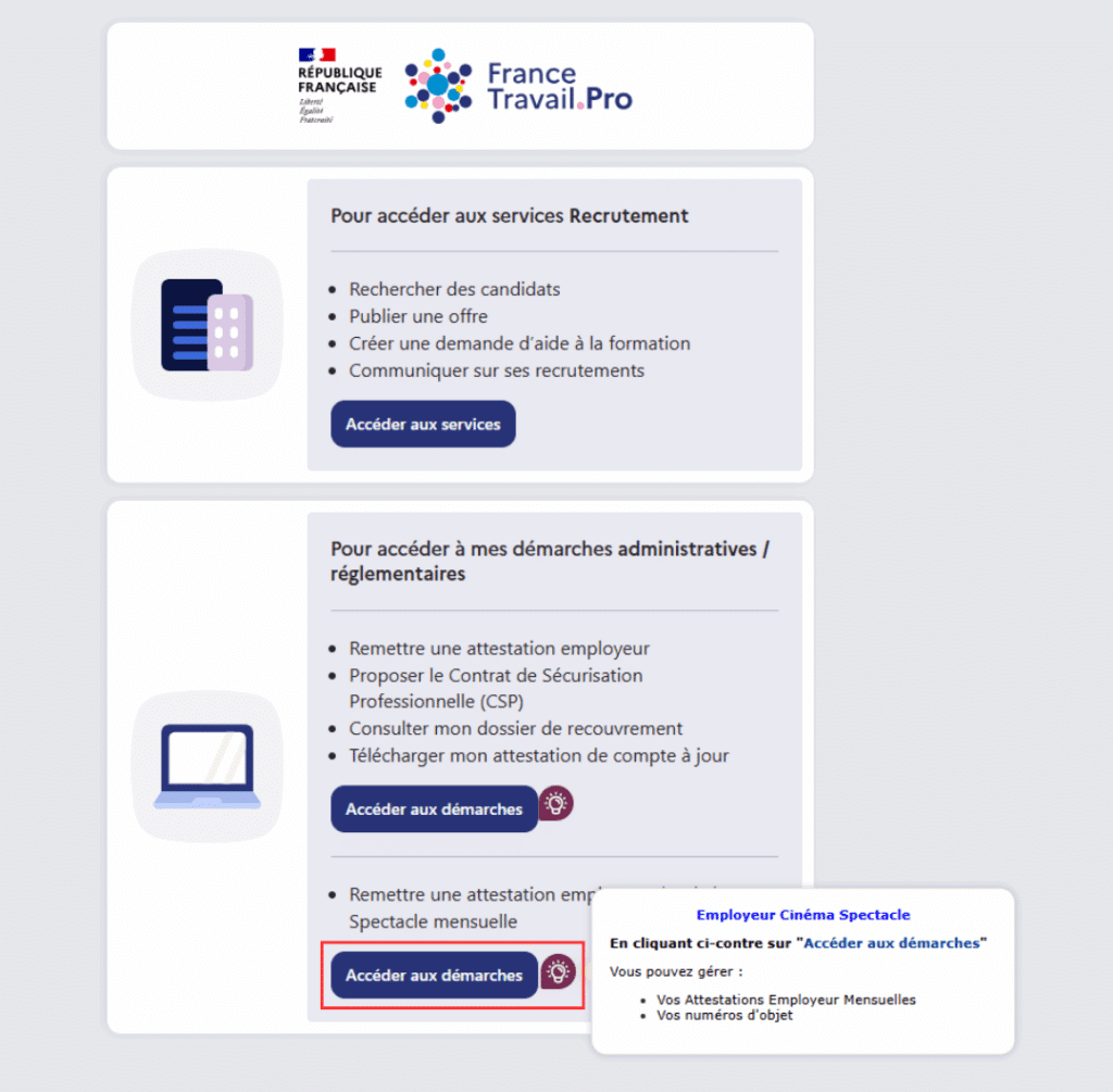 2. Ensuite, dans le second encadré « Pour accéder à mes démarches administratives / réglementaires« , cliquez sur le deuxième bouton « Accéder aux démarches » pour vous connecter à votre espace Employeur Cinéma Spectacle.